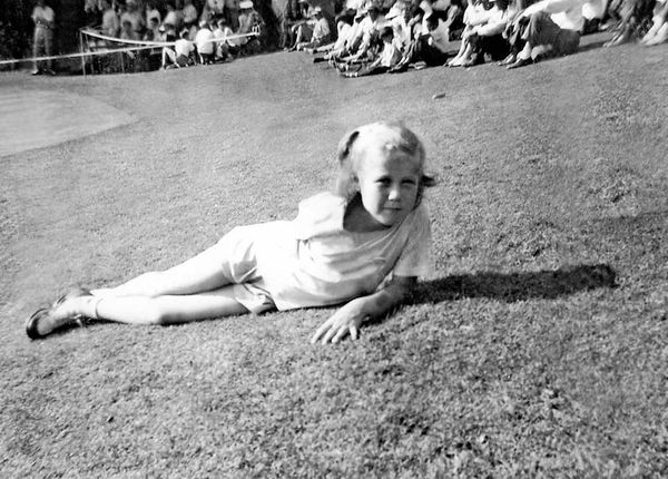 Young Marty lays in the grass at a golf event